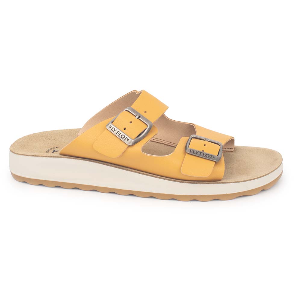 Diseño Clásico Renovado: Dos correas anchas con hebillas metálicas ajustables en un llamativo color amarillo mostaza. El contraste con la suela crema y la plantilla ocre le otorga un aire moderno y artesanal.