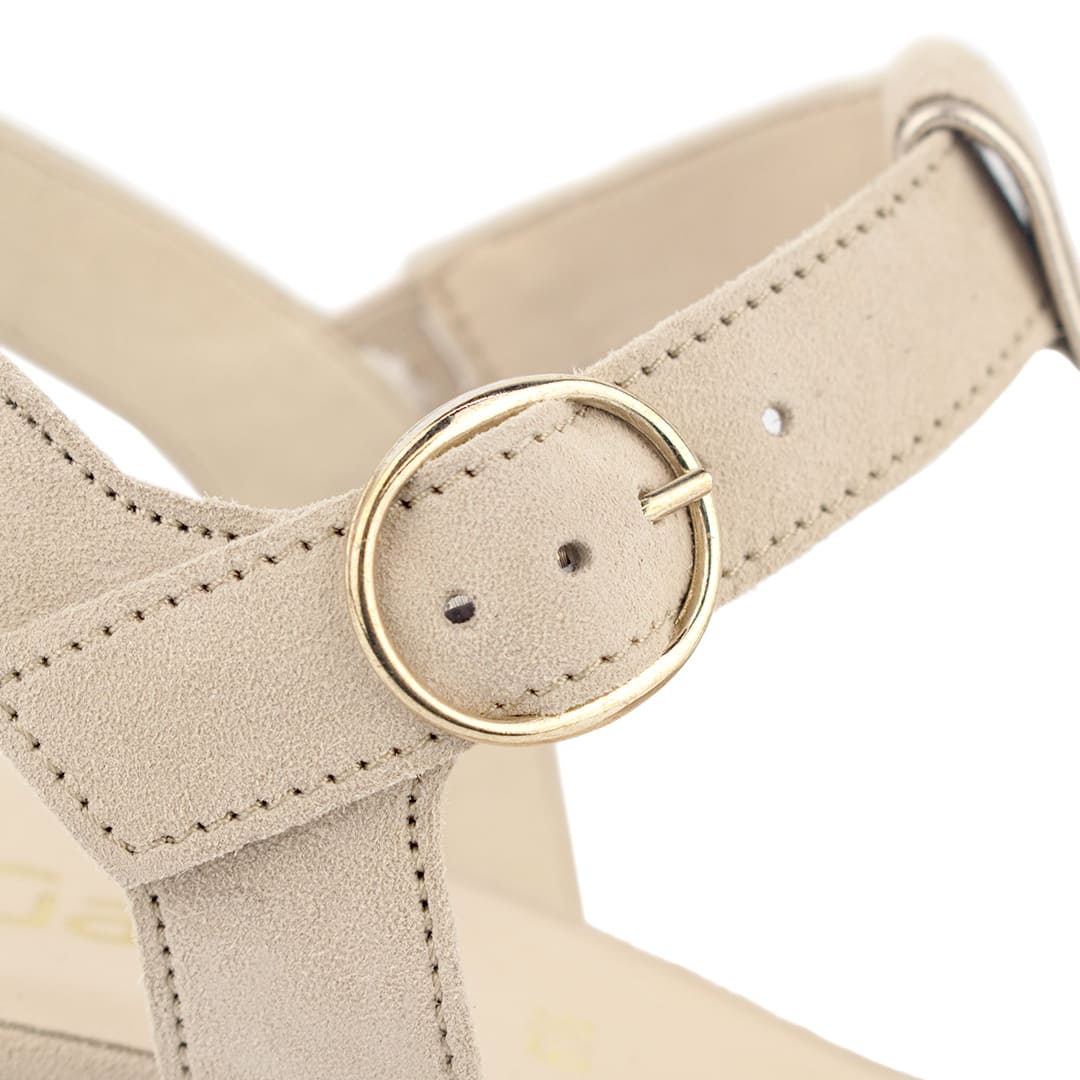Esta sandalia de tacón medio combina el diseño atemporal con la comodidad que necesitas para tu día a día. Su empeine en suave nobuk beige abraza el pie con elegancia, mientras que la tira en T estiliza el empeine y brinda sujeción adicional.