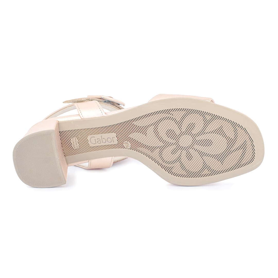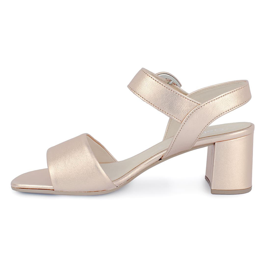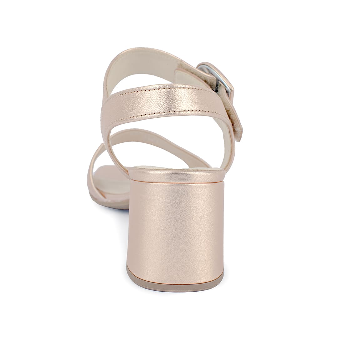 Esta sandalia de tacón medio es la combinación perfecta entre elegancia y funcionalidad. Su acabado metalizado en tono rose añade un toque de sofisticación a cualquier look, mientras que la correa con hebilla redonda ajustable garantiza un ajuste seguro y femenino.