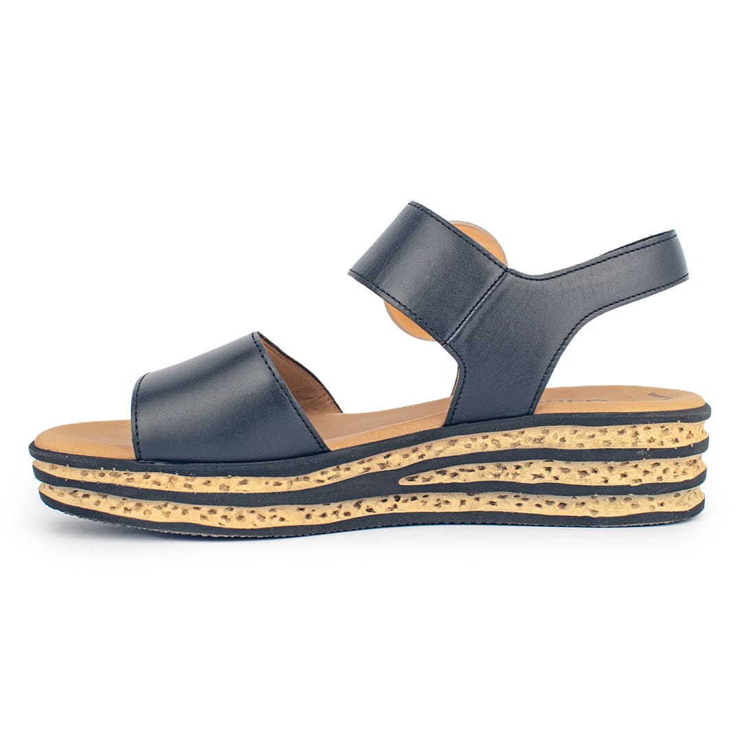 Esta sandalia en tono latte destaca por su diseño moderno y llamativo. El empeine blanco de líneas limpias combina con una plataforma bicolor de efecto corcho y negro que aporta altura sin comprometer la estabilidad.