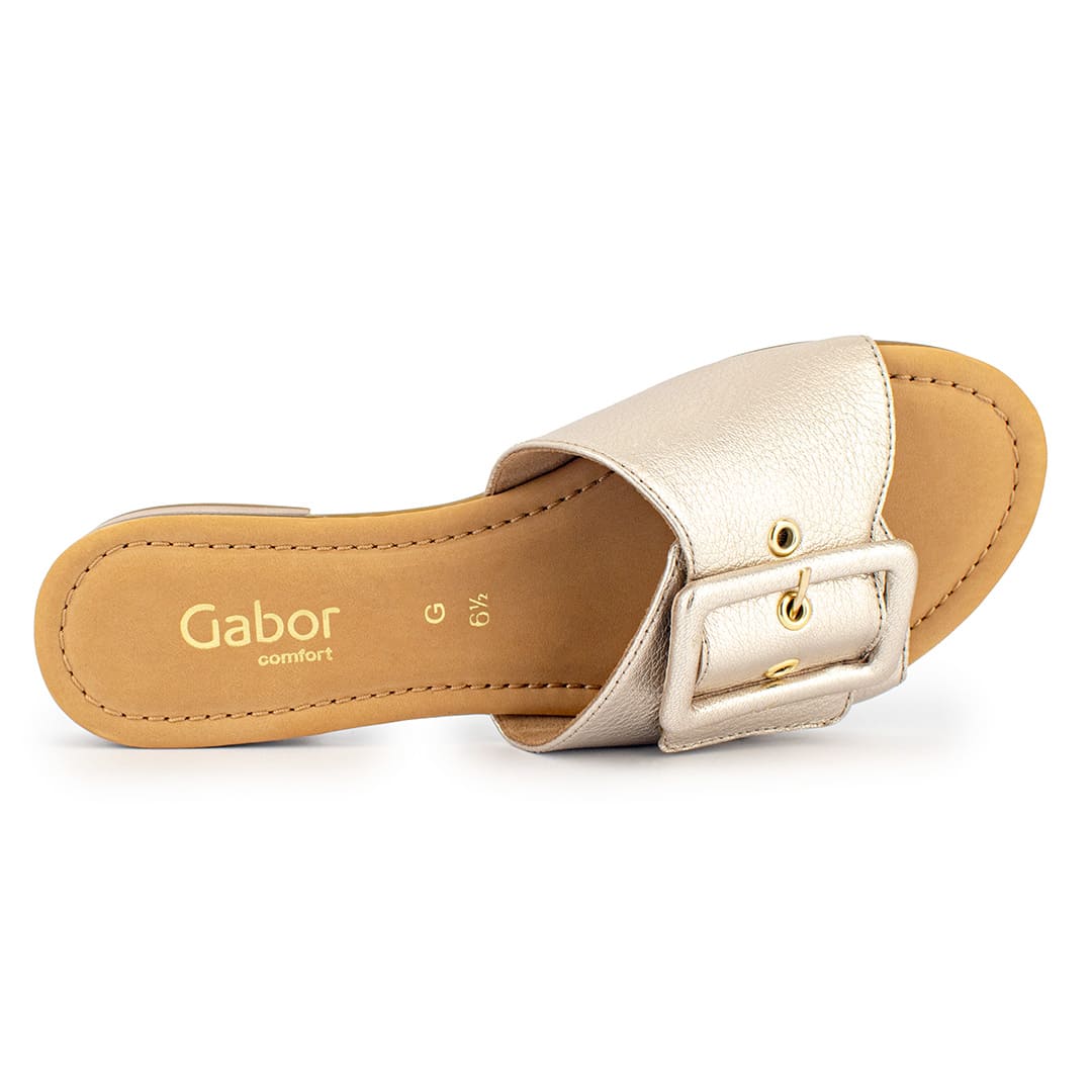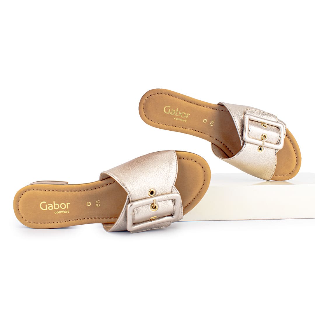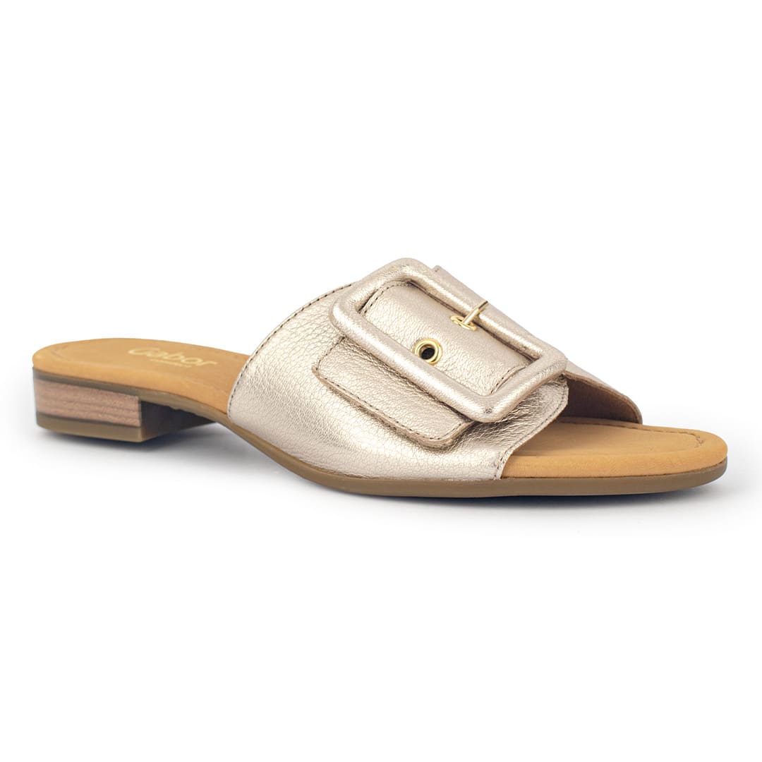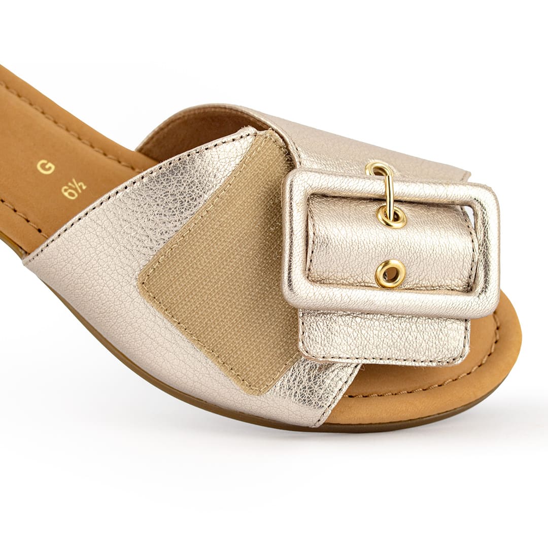 Esta sandalia tipo slide en tono champagne metalizado aporta un toque de sofisticación a un diseño casual y funcional. El empeine ancho con hebilla forrada a tono marca la diferencia con estilo, mientras que la plantilla acolchada ofrece confort en cada paso.