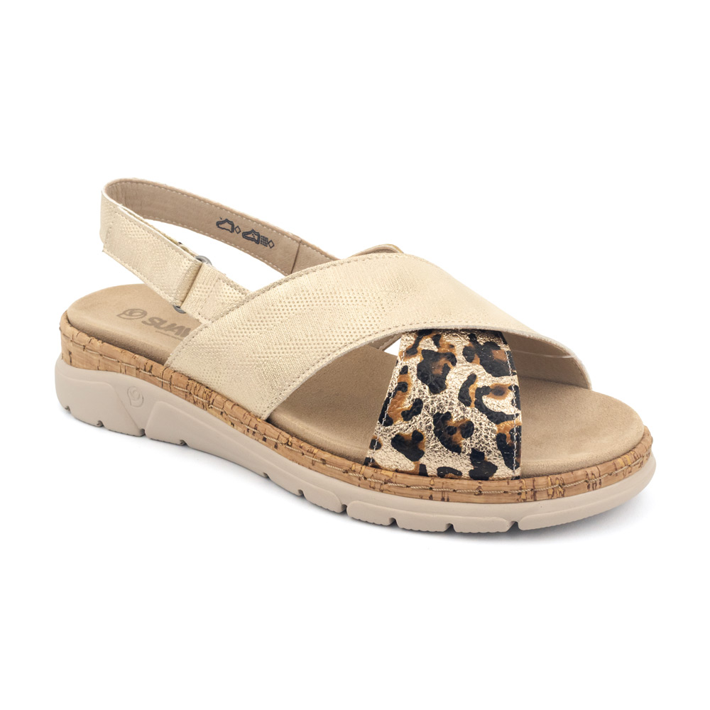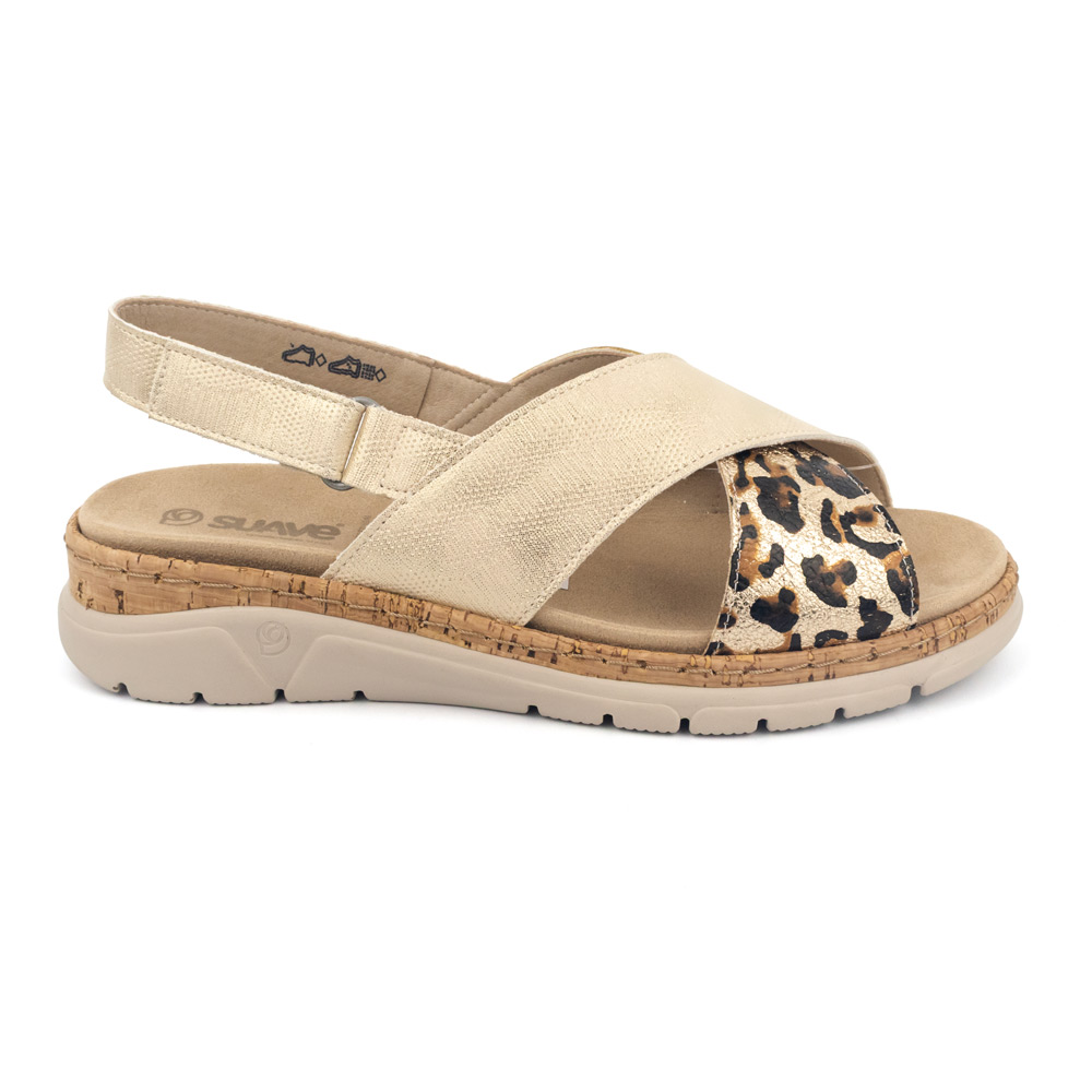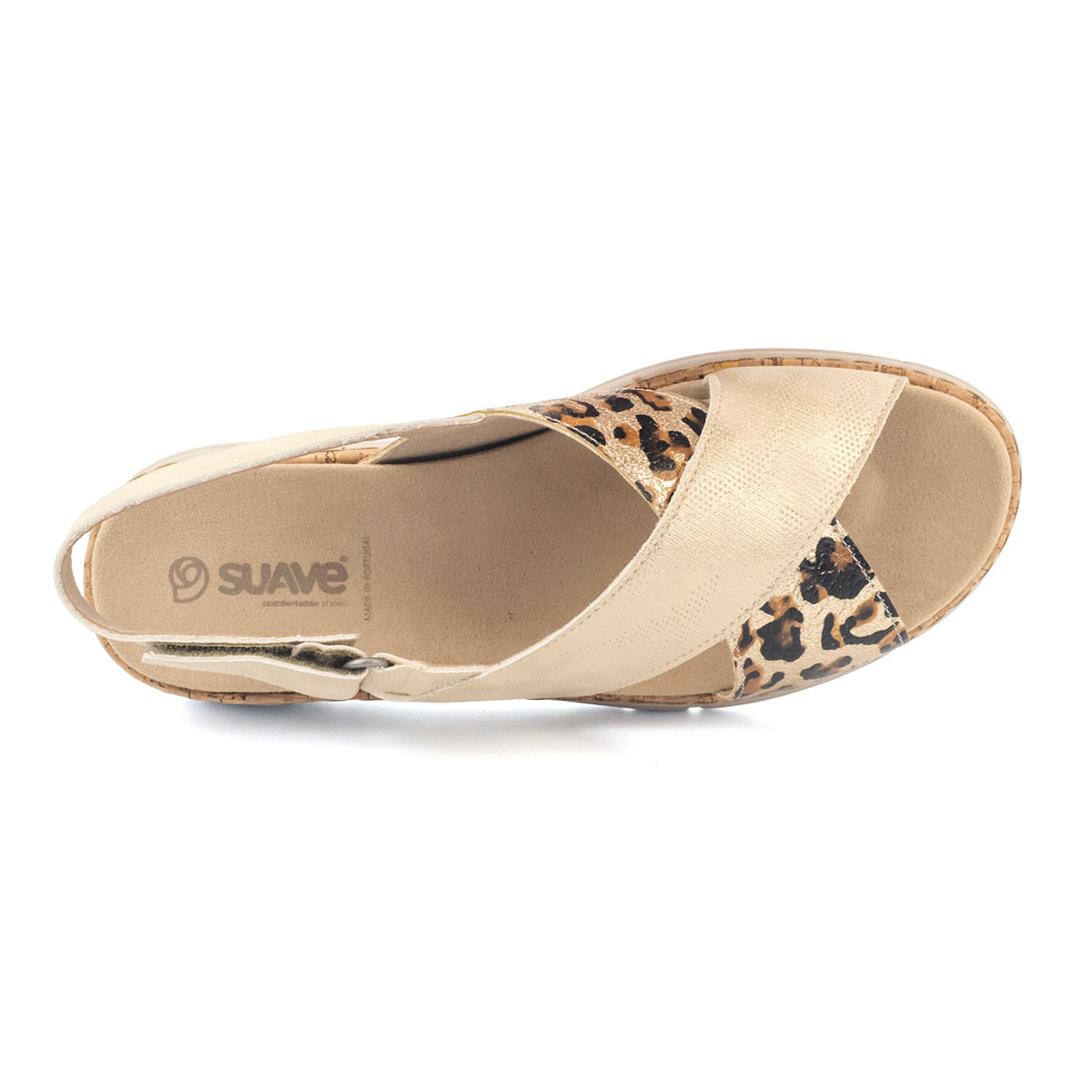 Material Premium: Confeccionada con piel natural de alta calidad que combina una textura metalizada en tono beige champaña con un llamativo detalle de animal print de leopardo en la banda frontal.