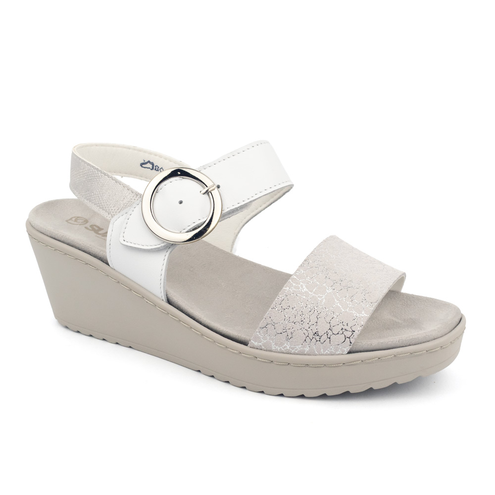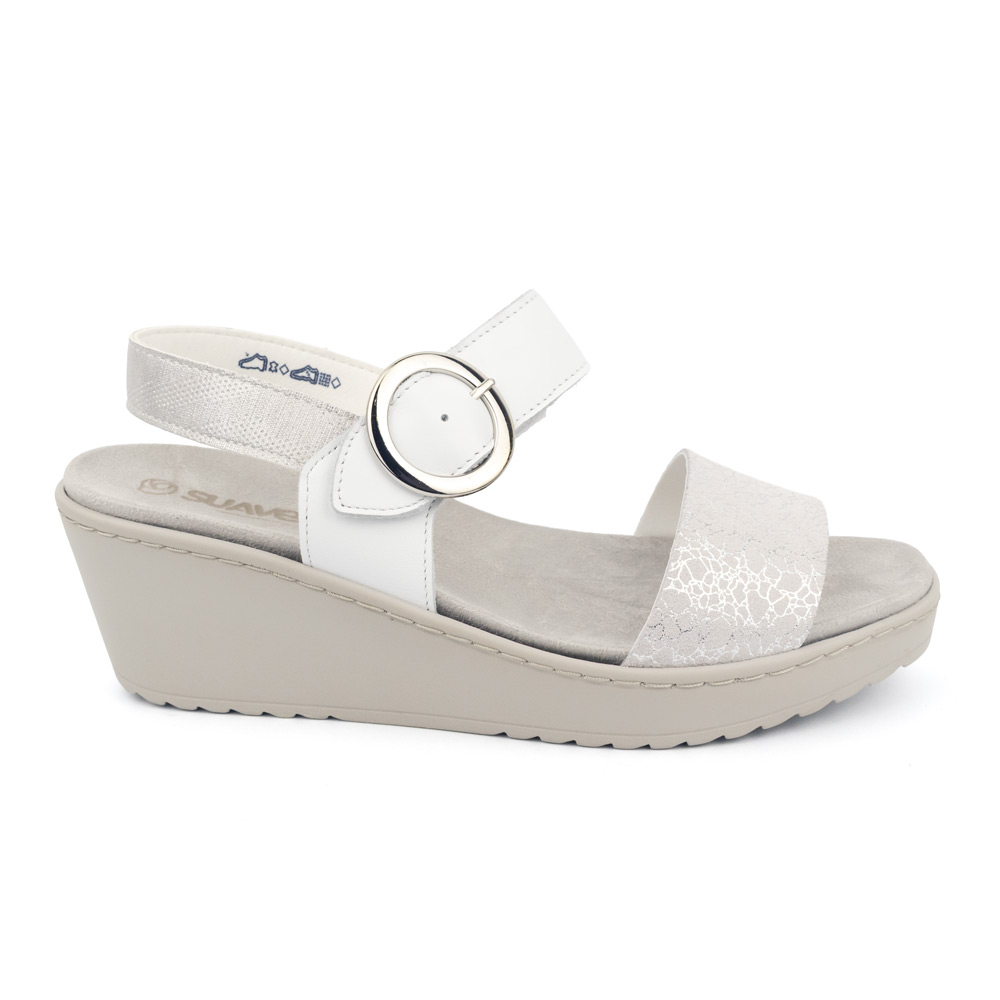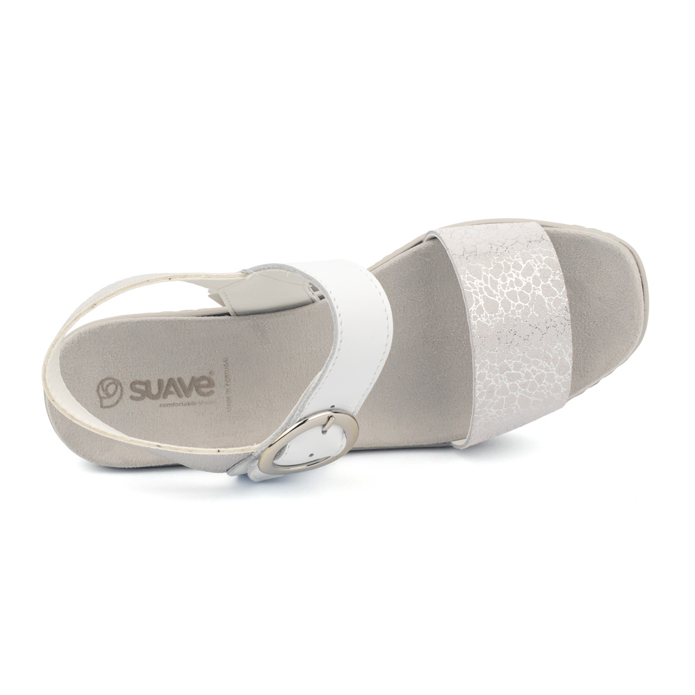 Material de Diseño: Confeccionada en piel natural blanca de alta calidad, combinada con una banda frontal y correa posterior en textil con acabado metalizado “crackled” plata, aportando un toque de brillo sutil y moderno.