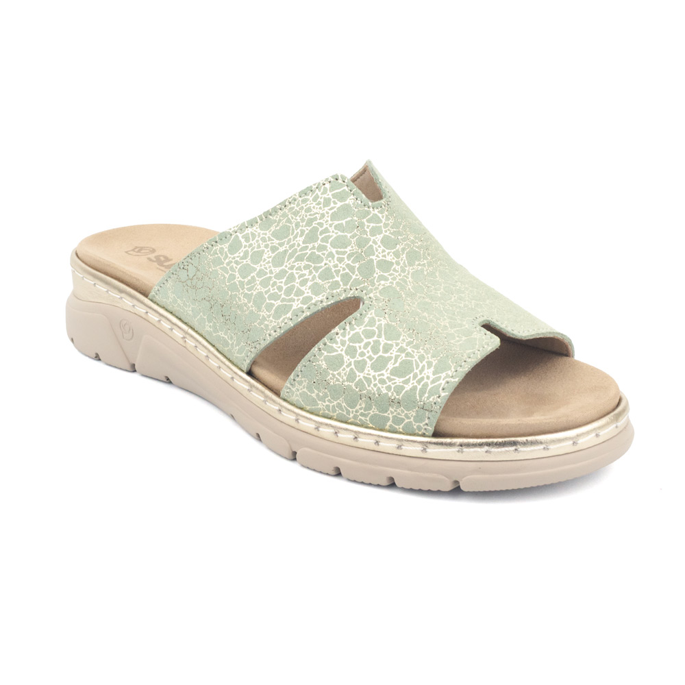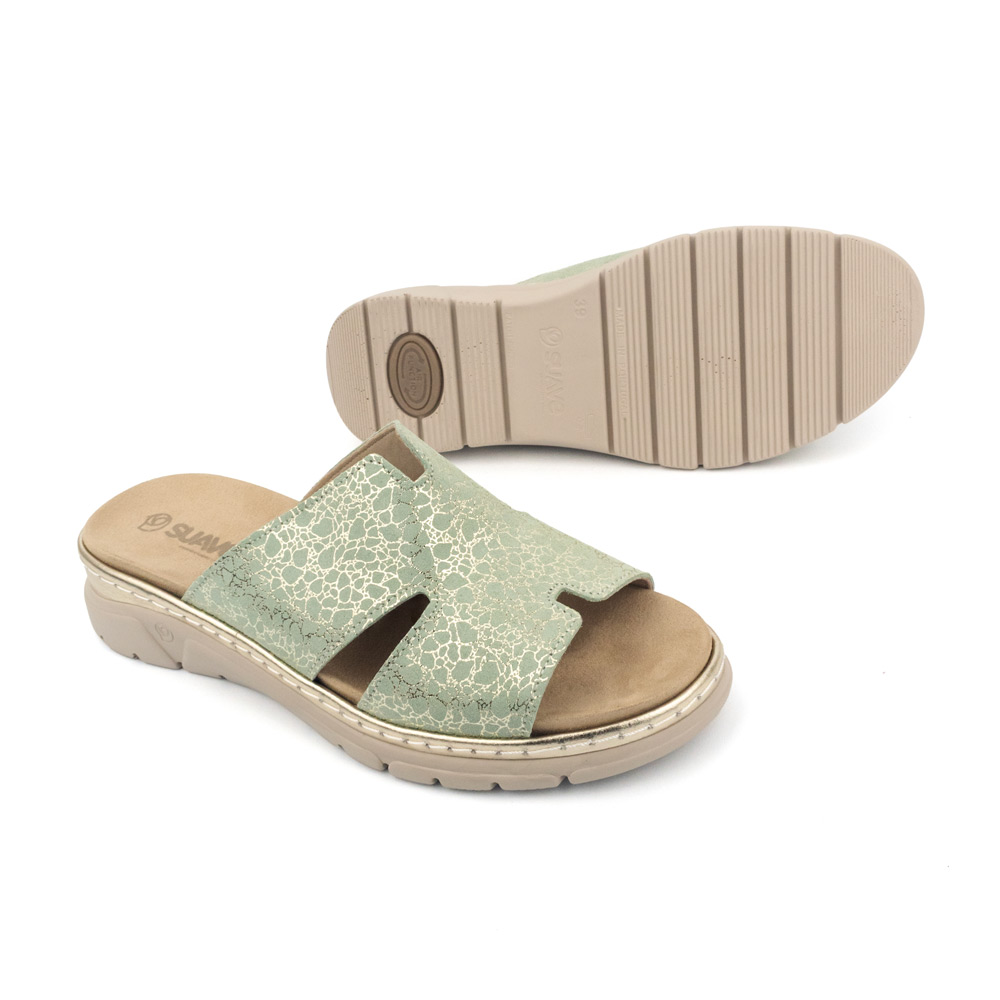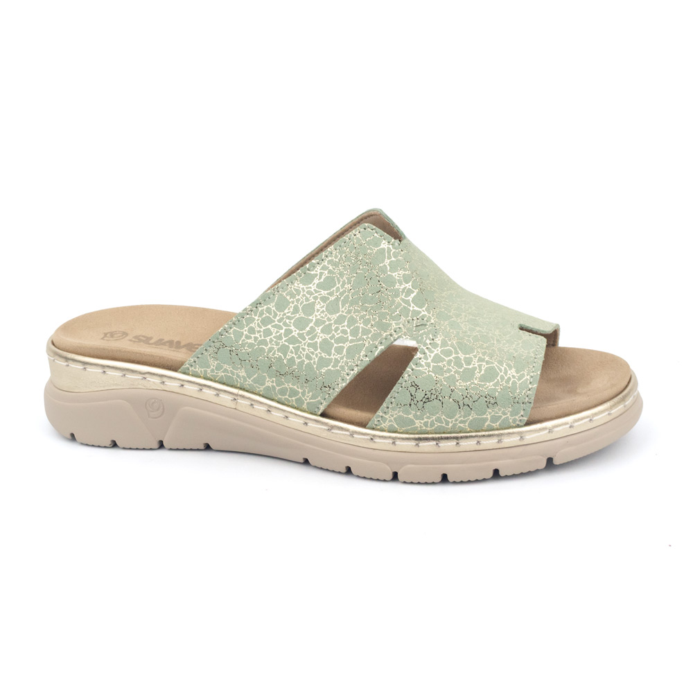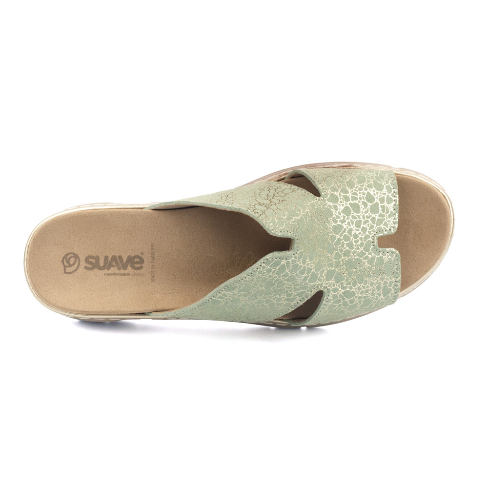 Material de Alta Gama: Confeccionada en piel natural con un acabado texturizado exclusivo en color verde menta y destellos metalizados, que aporta un estilo fresco y sofisticado.